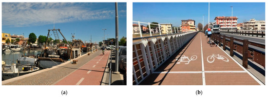 Rimini also offers a great variety of routes to cyclists, thanks to its network of cycle paths (more than 120 km of “Bicipolitana”), which go from the flat roads of the coast and the historic centre directly back to the hills. On the right side of the Canal Port there is a two-way cycle path on a raised pavement, which runs along the port beside the road. The cycle path is properly delimited with specific vertical and horizontal signs and red paving (Figure 2).