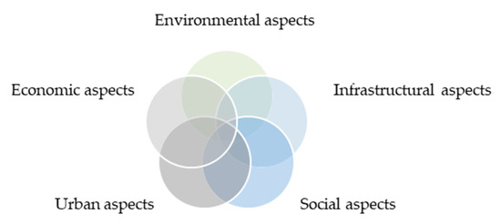 In order to assess urban quality, support the design choices, and the monitoring phase of the proposed interventions, it was decided to identify a set of indicators: this solution allows for a qualitative–quantitative assessment of the various aspects that contribute to pursuing the objective of a sustainable city. The indicators identified for the study area were classified according to five categories in order to analyse not only the aspects included in the Venn diagram, but also the infrastructural aspects related to transport and those of urban morphology related to the context (Figure 3). The decision to integrate these other two categories with those already present in the conventional Venn diagram was made because the urban and transport system has a decisive influence on urban well-being and, consequently, on the sustainability of the project intervention.