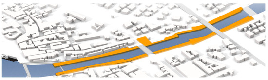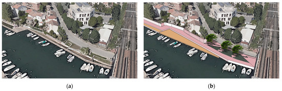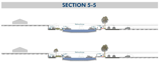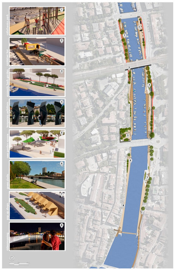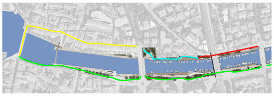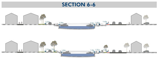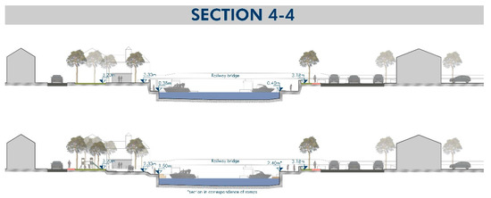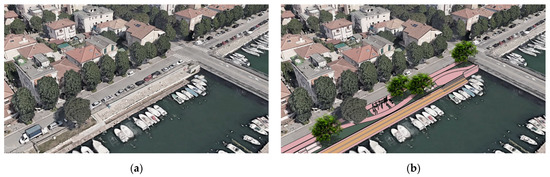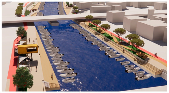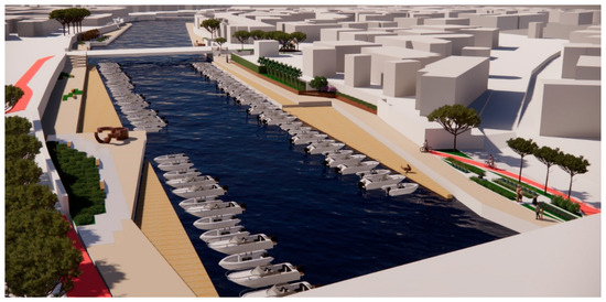The accesses to the quays and public spaces were studied in order to identify new functions for the benefit of the community. Following the raising of the docks, the bicycle and pedestrian paths along the two banks of the Canal Port were reviewed. The new cycle and pedestrian infrastructure can improve public health and make cities more active and environmentally friendly. Recent studies have shown that the regeneration of urban public spaces is closely related to the presence of safe and connected cycling and pedestrian path [52,53,54,55]. The proposed solutions are currently being defined and refined and could receive funding from the Municipality of Rimini to be implemented.