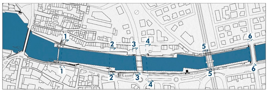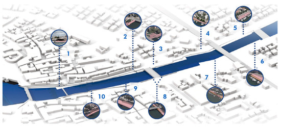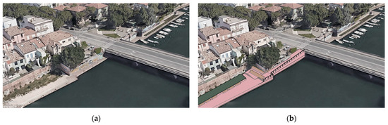 As mentioned, downstream of Ponte della Resistenza the quays have already been recently renewed by the Municipality of Rimini. In that stretch, the docks are never lower than 1.20 m a.s.l. and are not flooded as frequently as in the stretch upstream from Ponte della Resistenza Bridge. For this reason, the design proposal focused on the quays between Tiberius Bridge and Ponte della Resistenza Bridge, highlighted in Figure 5.