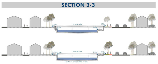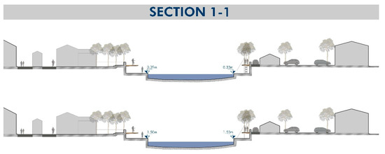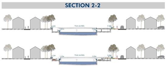 From the consultations with the Emilia–Romagna Region’s technicians and the study of the material provided by the Municipality of Rimini, it was deducted that it was necessary to raise the docks to a height between 1.30 and 1.70 m a.s.l. Such a height represents the optimal compromise for the safety of quays in the long term, since it also takes into account the subsidence phenomenon, while respecting the urban context in which the intervention takes place. Specific solutions need to be assessed to allow access to mooring (e.g., by means of floating platforms). The docks downstream from Ponte della Resistenza are at an elevation of 1.24 m a.s.l. and have been recently renovated; therefore, they have not been considered in the project.