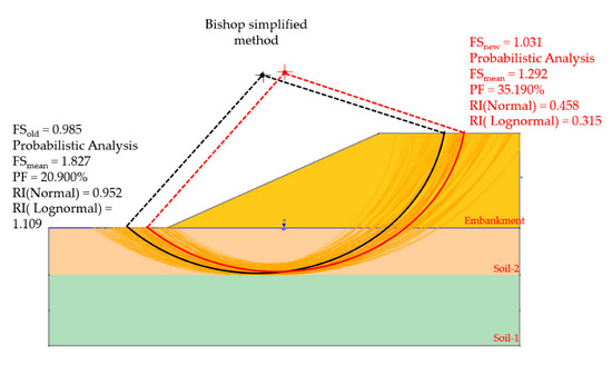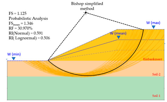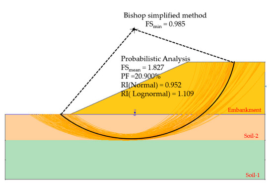 Preliminary design of slope stability analysis in Figure 3, the safety factor of the preliminary design was 0.985, and the critical slip surface was provided by the black line under the slice element. For the stability of the slope to be considered safe, the safety of factors must be greater than 1. Thus, the strength properties of the soils should be improved. Herein, the probabilistic analysis method was used to perform a back analysis of the material strength parameters. The analysis procedures were divided into two categories depending on the level of flood water.