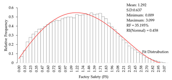 Monte Carlo Simulation was a method for calculating a deterministic model iteratively using sets of random numbers as inputs that were proposed by Metropolis and Ulam [20,25]. The probabilistic slope analysis methodology based on the Monte Carlo simulation developed has the advantages of being simple and not requiring a comprehensive statistical and mathematical background. In slope stability analysis, this method is defined as an approximate method in which a random value for each input variable from within the defined probability distributions. The simulation iterations procedure has been used both ways to measure the accuracy and precision of results [26]. The data generated by Monte Carlo simulation can be expressed as a probability distribution (or histogram) or converted to error bars, reliability forecasts, tolerance zones, and confidence intervals. In slope stability analysis, the system failure probability () can be calculated using Equation (2) [27].