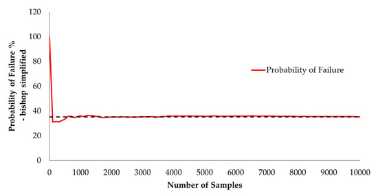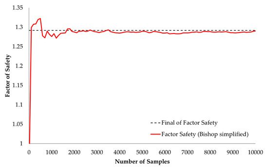 The mean, standard deviation, minimum, and maximum of factory safety are presented in the histogram graph, as shown in Figure 5. The convergence of the Monte Carlo simulation is shown in Figure 6 and Figure 7, which were plotted against random samples. The graphs show that after 2500 random samples, the Monte Carlo simulation converges without fluctuation. In total, 3519 random samples with FS less than zero were found. Thus, PF was calculated by 3519/10,000 = 0.3519 (35.190%).