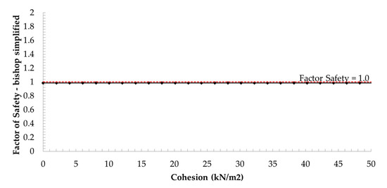 The ratio of the available shear force and the acting shear force can be expressed in terms of factors of safety (FS). This is the first computing in the slope stability analysis. FS is determined for the surface that is most likely to fail by sliding, critical slip surface. Iterative aspects are used to selection of a potential sliding mass, subdivision this mass into a series of slices, and the force equilibrium of each of these slices computed. There are various methods to analyze slope stability, such as the Swedish Circle method [5], the Bishop simplified method [6], the Janbu simplified method [7], the Spencer method [8], and the GLE–Morgenstern–Price [9], inter alia. In all these methods, limit equilibrium slip circle analysis has been considered according to the influence of soil strength as a negative safety factor. A few slope stability methods were classified by [10,11], which presented assumptions and limitations of these analysis methods and compared the FS of the various methods, as shown in Table 1. The lowest FS indicates the global stability of the slope and is always larger than 1. It generally consists of between 1 and 1.3, depending on the regulations. When FS close to 1 indicates a slightly stable slope that requires attention, monitoring, and/or engineering interventions to increase safety factors to reduce the probability of slope movement.