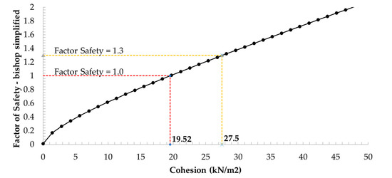 However, the safety factor was calculated by the probabilistic analysis with random variables in a critical scenario. The recommended international standard presents the minimum factor required for safety for embankments and foundations, which are 1.3 for end-of-construction conditions and 1.1–1.2 for the rapid drawdown condition [29]. The sensitivity analysis results in Figure 8, Figure 9 and Figure 10 were guidelines for improving the strength properties of the Bang-Ban-Bang-Sai Road embankment.