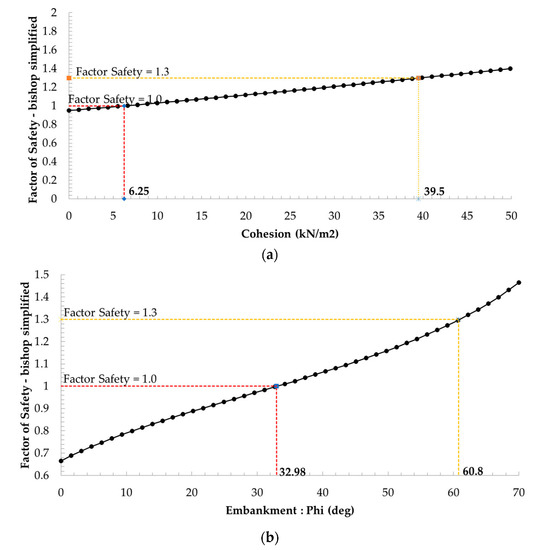 Sensitivity plot of a soil strength parameter of the embankment. (a) Sensitivity plot of a cohesion parameter, (b) sensitivity plot of a friction angle parameter.