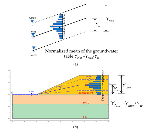 In this section, the level of groundwater was induced by the flood water lever. The extreme level of the groundwater of the Bang-Ban-Bang-Sai Road embankment model is shown in Figure 2. The material properties in Table 5 were implemented into the geometry model. The upper and lower groundwater levels were used to define the normalized mean of the groundwater table (YNm), as shown in Figure 12. The distribution function was a function used to provide the probability of all possible values. A detailed listing of the different types of probability distribution functions was included in [30]. The uniform distribution was selected for determining the water table level. The upper and lower limits of groundwater were generated for a random variables analysis. The groundwater levels were obtained by the observation-well test. The upper groundwater was measured during the flooding session, and the lower groundwater used observation-well test data 14 days after the flood.