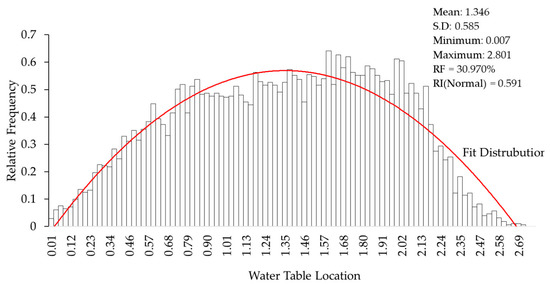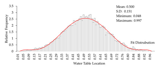 The groundwater table was randomized between 0 and 1 with the probabilistic distribution function. The normalized mean groundwater table was set to 0.5 for the groundwater level in the Monte Carlo simulation (Figure 13). A sample size of 10,000 samplings was created for each of the variables involved, including the groundwater table.