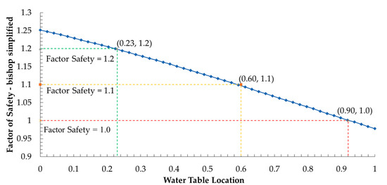 The sensitivity variable (Figure 16) represented the water table location, which was a normalized variable. By using the recommendation in [29], the highest safety factor (FS = 1.2) occurs when the water table level is equal to 0.23 times the mean water table location (minimum water table). The minimum safety (FS = 1.1) occurs when the water table level is equal to 0.60 times the mean water table location (maximum water table). In the flood session, the groundwater level should be controlled no more than 0.9 times the mean water table location.