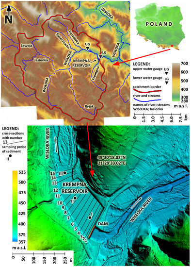The small reservoir Krempna is located in the upper reaches of the Wisłoka River (Figure 1), 145.0 km from its mouth to the Vistula. The Wisłoka River from its sources to the reservoir in Krempna is 18.6 km long and covers a subcatchment area of 165.3 km2. The total length of the Wisłoka River is 163.6 km, and its catchment area is 4110.2 km2. The Wisłoka River belongs to the Upper Vistula Basin, which covers an area within three great physical-geographical units, that is, the Carpathians, Subcarpathian Basins, and Lesser Poland Uplands.