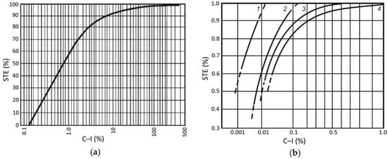 It is not possible to determine the STE from the Drozd nomogram, as the tested small reservoir has C–I values of 0.350% and 0.228%, which are outside the lower range of the curve no. 3 (dust sediment) in this nomogram (Figure 2b), amounting to approximately 1%.