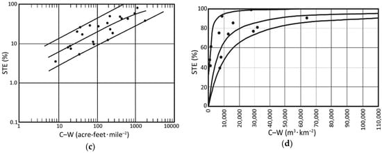 The methods of Brown, Brune and Allen, and Gotshalk’s method, in which the STE is presented in relation to the C–W ratio, also do not give the expected values—Brown’s method gives significantly underestimated values, while Brune’s and Allen’s methods overestimate them significantly, as they are close to the STE value of 100%. On the other hand, determining the STE value from the Gotshalk nomogram is impossible because the C–W values on the abscissa (horizontal) axis are given in thousands of m3∙km−2 (Figure 2d). Thus, as a result of an attempt to estimate the Krempna reservoir STE values, they would be of about 1–2% from this nomogram.