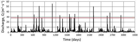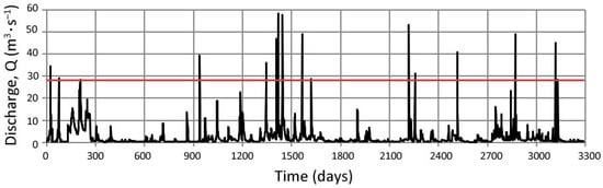 Hydrograph for the multiyear period of 2006–2018 with 16 waves with a probable flow greater than 50% = 26.14 m3∙s−1 (red line).