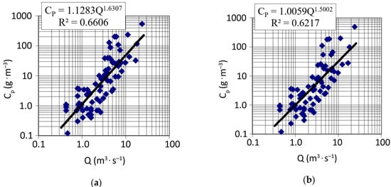 Relationship between the suspended sediment concentration measured in the point of cross section (CP) of a water gauge and mean 24 h flows (Q) established for: (a) cross section of the upper water gauge and (b) cross section of the lower water gauge season: summer heavy rainfalls.