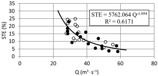 The correlation relationships between STE and Q were established for each of the two operating periods. The developed regression equations have the form of: STE = 4360.72 Q−1.585 for the 1987–2005 period (R2 = 0.5379, significance level = 0.05) and STE = 5150.42 Q−1.689 for the 2006–2018 period (R2 = 0.6890, significance level = 0.05). Figure 6 shows the correlation relationship developed for two operating periods. The developed relationship is significant at the level of 0.05.