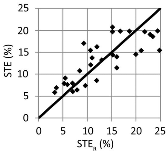 The developed equations are statistically significant at the significance level of 0.05, and the coefficients of determination for these equations are: R2 = 0.7847 for Equation (3) and R2 = 0.8884 for Equation (4). Table 5 and Table 6 present the results of the STE values forecasted using the developed correlation equations along with measures of their predictive efficiency. The calculated RMSE and MAE are 7.83 and 5.43 for Equation (3) (Table 5) and 3.54 and 2.40 for Equation (4) (Table 6), respectively. A significant difference in the values between MAE and RMSE (Δ), of 30% (Table 5) and 32.3% (Table 6), indicates the occurrence of large values of errors in the forecast period.