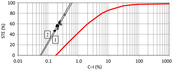 Sediment trap efficiency (STE) related to the C–I ratio for the Krempna reservoir compared with Brune’s curve (red): 1—STE regression line for the period 1987–2005 (empty points); 2—STE regression line for the period 2006–2018 (points filled with black).