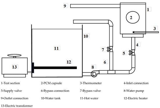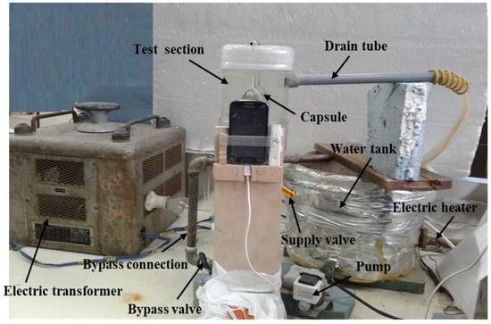 An image of the test rig is shown in Figure 1, while the layout is shown in Figure 2. The test rig consists of the water tank (10), which is made of galvanized sheet with a diameter of 40 cm and a height of 40 cm. The tank is used to supply the test section with hot water (11) at a constant temperature value. The tank is insulated with glass wool insulation to decrease the heat lost from hot water in the tank. The tank is equipped with a 1 kW electric heater (12) connected to the electrical main supply with a TROIDC type electric transformer (13). The electric transformer provides a voltage variation from 0 to 220 V to adjust the water temperature in the tank at a predefined temperature. The tank is equipped with a small 100-Watt water pump (8) connected to the tank bottom via an inlet connection (4) to supply the test section with the required hot water. The hot water is used to heat the capsule at different velocities using a supply valve (5) which regulates the water discharge rate to the test section (1). The valve (7) is used to bypass the excess water from the pump to the tank via a bypass connection (6), to prevent the pump from overheating.