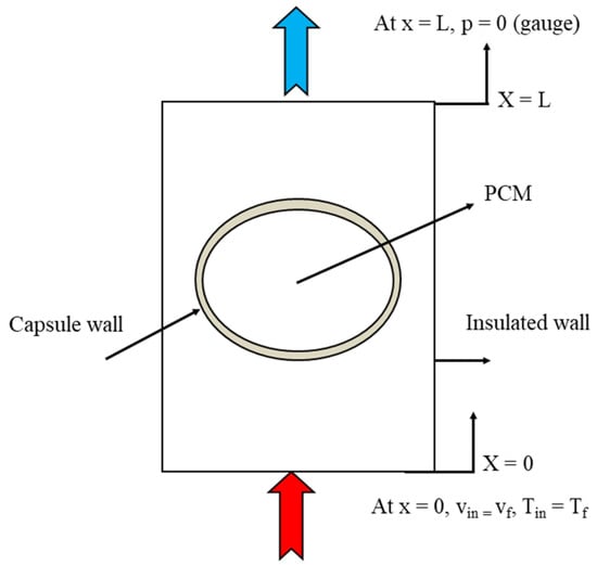 The previous governing equations were solved together with the following initial and boundary conditions. Initially, the system was at the ambient temperature of 27 °C, and the storage capsules were filled with solid paraffin wax, which was at a temperature lower than the melting point. The outer side of the tank was insulated; in addition, the inlet of the hot water was defined as the velocity inlet and the outlet of the hot water was defined as the pressure outlet, as shown in Figure 5.