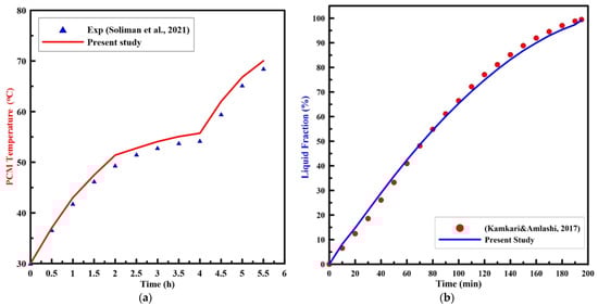 To validate the numerical model of melting in the present finite volume computational fluid dynamic (CFD) code, an initial run was established and compared to the experimental results of Soliman et al. [,] for a vertical cylinder that was heated by a constant heat flux, and Kamkari and Amlashi [] for a vertical enclosure that was heated by a constant wall temperature. The computational model and the experimental study were established under the same operating conditions. Figure 6 displays the PCM temperature and liquid fractions, with the melting time for the experimental results of [,], respectively, with the present numerical results. As can be noted from the figure, the numerical results are in good agreement with the experimental results.