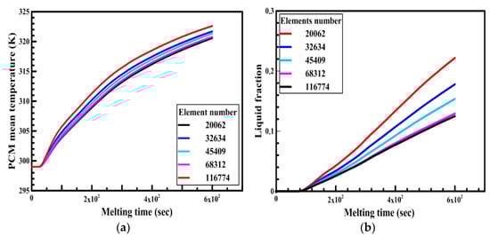 Free triangular mesh has been adapted in the numerical model. In order to test the dependency of numerical results on the mesh element size, a simulation was run with a circular capsule of 4 cm in diameter and 6 cm in length. The capsule was initially at 300 K. At any time, t > 0, the boundary of the capsule was at 340 K. The average temperature and liquid fraction of the PCM for the circular capsule were compared for different numbers of elements size (20,062, 32,634, 45,409, 68,312, and 87,472) as shown in Figure 7a,b. It is observed from the figure that there is a slight difference between the number of elements 68,312 and 87,472. Therefore, the number of elements equal to 68,312 is selected for the present study to save time. Similarly, a grid independency test has also been carried out for other configurations. The time steps used in the analysis is 0.3 sec throughout all models.
