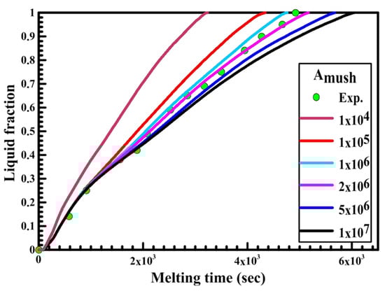 Secondly, the effect of the mushy zone parameter on the PCM melting process is studied and validated with the experimental results to obtain the optimum value of Amush for each shape. Figure 8, Figure 9 and Figure 10 illustrate the PCM liquid fraction with the melting time of the experimental result and the numerical results with different values of the mushy zone parameter.