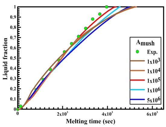 The minor number γ is used to avoid division by zero, and it is naturally about 10−3. The mushy zone constant Amush explains how steeply its velocity is condensed to zero when the material solidifies. Its value depends on the morphology of the medium. This value is frequently high and typically runs from 104 to 108. The same occurred when the local liquid fraction becomes high, and the velocity is reduced to zero. Numerous academics advise taking into account the Amush value of 106 as the best value. This value offers a good agreement between their experimental and numerical results []. In this study, Amush varies throughout the whole simulation, where it attains the best conformity between the experimental and numerical results.