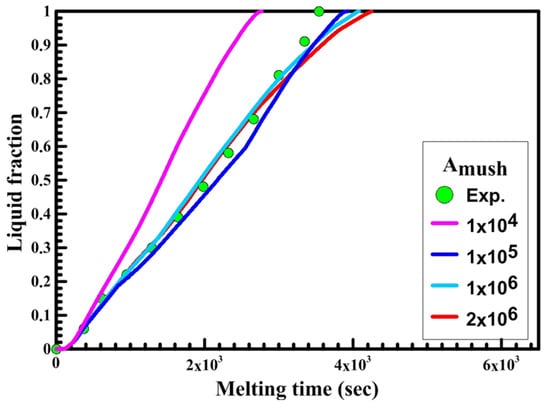 Figure 8 shows the relation between liquid fraction and time for both experimental and numerical results for a circular capsule at the HTF inlet temperature of 340 K and a velocity of 0.003 m/s. The numerical results are obtained with different values of Amush (1 × 104, 1 × 105, 2 × 106, 5 × 106, 1 × 107). It is observed from the figure that the melting rate of the numerical results is slow at Amush = 1 × 107, while at Amush = 1 × 104 the melting rate of the numerical results increases, and its value is greater than the experimental results.