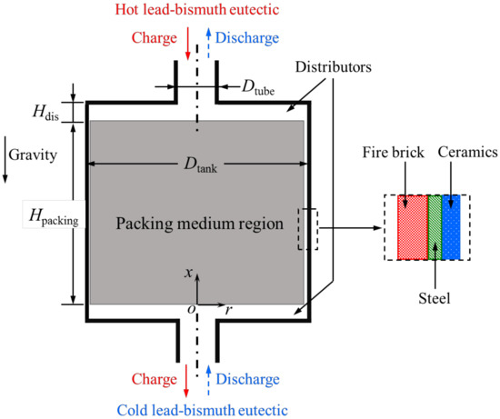 Figure 1 illustrates a liquid LBE thermocline heat storage tank that consists of three sections: the packing bed and the upper and lower distributors. The packing bed is composed of filling particles with an equivalent diameter of 60 mm. The vertical heights of the distributor, packing bed, and whole tank are Hdis (1 m), Hpacking (10 m), and Htank (14 m). The inner diameters of the inlet tube and LHM tank are Dtube (1 m) and Dtank (6 m). The thermocline thickness of the liquid LBE heat storage tank is dt. The wall of the liquid LBE tank is composed of three layers: fire brick, steel, and ceramic. Their densities are 2000 kg/m3, 8000 kg/m3, and 1000 kg/m3, their specific heat capacities are 1000 J/(kg∙K), 430 J/(kg∙K), and 1000 J/(kg∙K), and their thicknesses are 100 mm, 20 mm, and 50 mm respectively. The charging and discharging processes of the liquid LBE tank can also be seen in Figure 1.