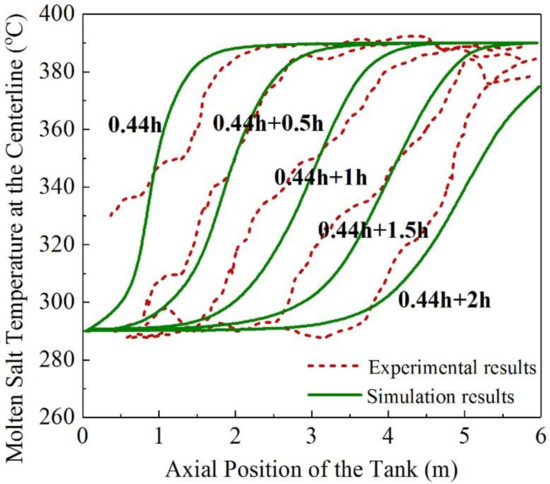 Based on the experimental results of a relevant study [16], the applicability of the numerical model of the liquid LBE thermocline tank was validated. According to the literature, the height and inner diameter of the experimental prototype were 5.9 m and 1.5 m. The HTF in the experimental facility was molten salt consisting of NaNO3 and KNO3. As presented in Figure 3, the results reveal a relatively acceptable agreement between the test and simulation results.