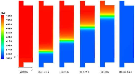 The charging and discharging processes of the liquid LBE heat storage tank were simulated. Figure 4 shows the liquid LBE temperature distributions of the tank during the discharging process. It can be seen that the thermocline was effectively formed and kept during the whole process. It could go up and through the tank stably, which means the liquid LBE tank had good operating stability. According to the simulation results, the total charging and total discharging durations were 5.7 h and 5.3 h, respectively, and the discharging efficiency was 91.94%, which is close to that reported in the previous literature (about 92%) [11]. The total discharging quantity of the tank was 2.75 × 1010 J (about 7.64 MWh). These results can provide reference values for the heat release capacity and operation parameter designs of actual TES tanks using liquid LBE.
