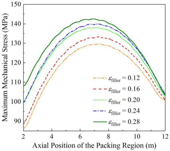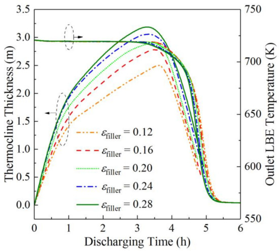The effect evaluation results of the porosity εfiller of the filling medium on the discharging and mechanical performances of the liquid LBE heat storage tank are provided in Figure 5, Figure 6 and Figure 7. The circles in the figures indicate the ordinates corresponding to the curves surrounded by them. As is shown in Figure 5 and Figure 6, the porosity of the filling medium had no obvious influence on the total discharging duration tdischarge or the maximum discharging power Pmax of the tank, but did affect the thermocline thickness of the tank. The thermocline thickness of the tank during the discharging process increased as the porosity of the filling medium increased. This agrees with the results reported in the previous literature [13].