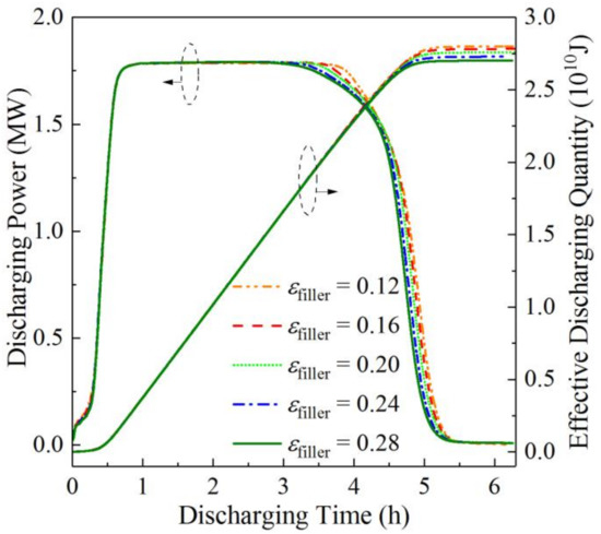 Discharging power and total discharging quantity variations at different filling medium porosities.