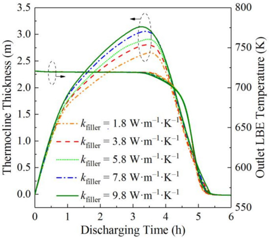 According to Figure 8, the thermal conductivity of the filling particles essentially had no effects on the total discharging duration or the outlet LBE temperature, though it had an obvious impact on the thermocline thickness of the liquid LBE tank during discharging processes. As the thermal conductivity of the filling particles increased, the maximum thermocline thickness of the liquid LBE tank increased. This was due to an improvement in the heat transfer between the liquid LBE and the filling medium caused by an increase in the thermal conductivity of the filling particles. This conclusion agrees with that reported in the previous literature [12]. When the thermal conductivity of the filling particles was 9.8 W/(m∙K), the maximum thermocline thickness of the tank was 3.3 m. The results of Figure 9 reveal that the thermal conductivity of filling particles had little effect on either the maximum discharging power or the total discharging quantity of the liquid LBE tank.