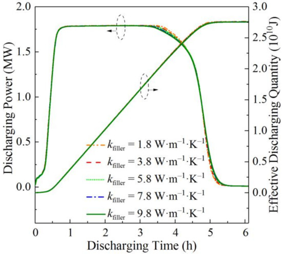 Discharging power and total discharging quantity variations at different thermal conductivities of the filling particles.