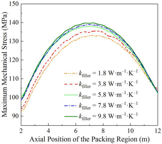 The axial MMS distribution variations of the liquid LBE tank at different thermal conductivities of the filling particles are shown in Figure 10. It can be seen that the peak MMS increased as the thermal conductivity of the filling particles increased. This is because a lower particle thermal conductivity will weaken the heat transfer between the liquid LBE and the filling particles, as well as the heat transfer between the tank wall and the packing bed. This reduces the maximum temperature of the steel wall during the operating cycle, resulting in a smaller MMS. This was also reported in the relevant study [13]. When the thermal conductivity of the filling particles was 9.8 W/(m∙K), the peak MMS of the tank wall was 139.8 MPa. Therefore, it was demonstrated that by decreasing the thermal conductivity of the filling particles, the thermocline thickness during the discharging process and the peak MMS can both be decreased.