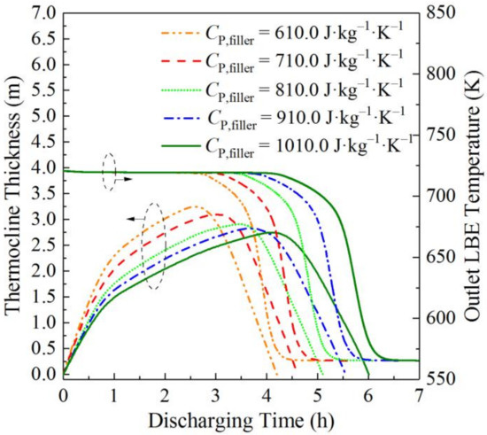 The effect evaluation results of the specific heat capacity CP,filler of the filling particles on the discharging behavior of the liquid LBE tank are shown in Figure 11 and Figure 12. According to the two figures, the specific heat capacity of the filling particles had an obvious effect on the discharging process. As the specific heat capacity of the filling particles increased from 610.0 J/(kg∙K) to 1010.0 J/(kg∙K), the total discharging duration increased from 4.5 h to 6.5 h, the maximum thermocline thickness decreased from 3.4 m to 2.8 m, the total discharging quantity of the tank increased from 2.19 × 1010 J to 3.34 × 1010 J, while the maximum discharging power of the tank was basically unchanged. The maximum thermocline thickness decreased with the increase in the specific heat capacity of the filling particles because the temperature increase caused by the same heat quantity reduced when the specific heat capacity of the filling particles increased. The total discharging quantity increased with the increase in the specific heat capacity of the filling particles because for the same temperature variation the heat release of the filling medium with the higher specific heat capacity was larger.