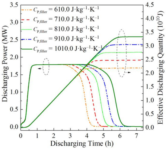 Discharging power and total discharging quantity variations at different specific heat capacities of the filling particles.