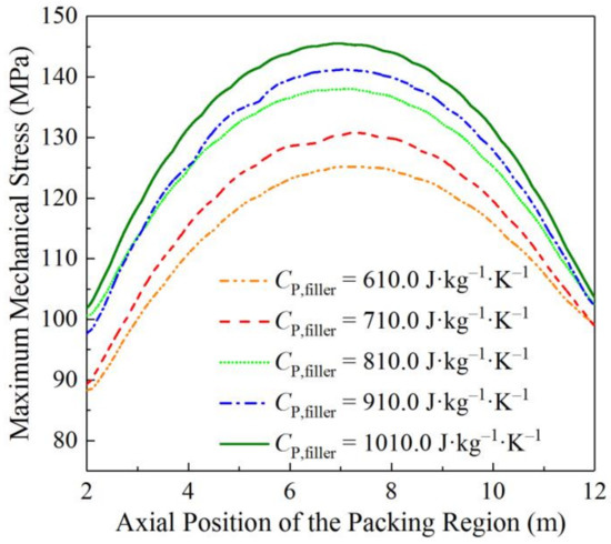 Figure 13 presents the axial MMS distributions of the liquid LBE tank at different specific heat capacities of the filling particles. The results reveal that the peak MMS increased as the specific heat capacity of the filling particles increased. When the specific heat capacity of the filling particles was 1010.0 J/(kg∙K), the peak MMS was 145.6 MPa. Hence, by increasing the specific heat capacity of the filling particles, the thermocline thickness during the discharging process can be reduced and the total discharging duration and total discharging quantity of the tank can both be increased, but the peak MMS will also be increased.