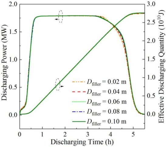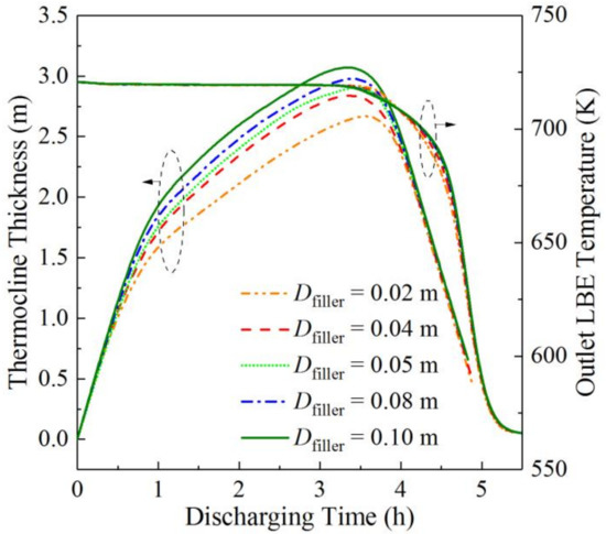 This section presents the effect evaluation results of the equivalent diameter Dfiller of the filling particles on the performances of the liquid LBE thermocline heat storage tank. Figure 14 shows the variations of thermocline thickness and the outlet LBE temperature of the tank at different equivalent diameters of the filling particles. The results reveal that the equivalent diameter of filling particles had a very small effect on the total discharging duration, and that the thermocline thickness of the tank during the discharging process increased when the equivalent diameter of the filling particles increased. This is because increasing the equivalent diameter of the filling particles can lead to the temperature difference between the liquid LBE and the solid particle surfaces increasing, as well as that within the solid particles, which contributes to a faster thermocline expansion and thus results in a thicker thermocline layer. This conclusion is similar to that reported in [17]. When the equivalent diameter of the filling particles increased to 0.10 m, the maximum thermocline thickness of the tank was 3.1 m. According to Figure 15, the effects of the equivalent diameter of the filling particles on the maximum discharging power and total discharging quantity of the tank were both very small. These results are similar to those of the effect evaluations of the porosity and thermal conductivity of the filling particles on the discharging performance.