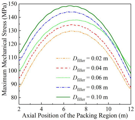 Figure 16 shows the axial MMS distributions of the liquid LBE thermocline tank at different equivalent diameters of the filling particles. The results show that as the equivalent diameter of the filling particles increased from 0.02 m to 0.10 m, the peak MMS increased from 129.4 MPa to 148.7 MPa. The reason for this influence law is similar to that of the filling medium porosity. Thus, it can be concluded that by decreasing the equivalent diameter of the filling particles, the thermocline thickness during the discharging process and the peak MMS can be both reduced.
