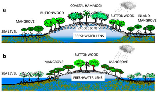 A sketch of a coastal hammock (a) on an elevated rise flanked by buttonwood forests at intermediate elevations and mangrove forests at sea level. Also shown is the vadose zone (zone from the ground to the water table), freshwater lens (where shading indicates increasing brackishness towards the bottom of lens), and seawater. Bottom sketch (b) shows a rise in sea level that decreases the volume available to hold freshwater in the freshwater lens, with consequent mortality of coastal hammocks and the upward migration of buttonwoods and mangroves. Elevation exaggerated in illustration to indicate water pools (reproduced from [] with permission).