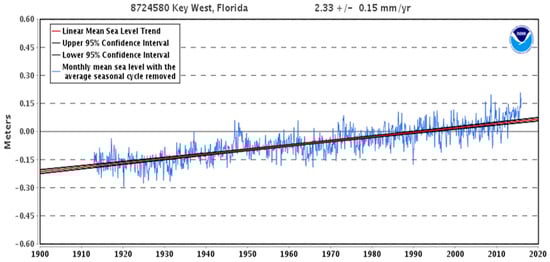 According to the NOAA Station KYWF1-8724580 (Key West ocean data buoy), the rate of SLR in the Florida Keys had been an average rate of 0.23 cm/yr (Figure 4) prior to the last decade []. The NOAA plot shows monthly mean sea level without regular seasonal fluctuations due to coastal ocean temperatures, salinities, winds, atmospheric pressures, and ocean currents. The long-term linear trend is also shown, including its 95% confidence interval. The plotted values are relative to the most recent Mean Sea Level datum. It is noticeable in Figure 4 that the sea level rose around 1945 (3-year duration) and again in the early 1970s (5-year duration). The difference in those trends, and the current acceleration trend, is that greenhouse gases (GHGs) are presently rising at a faster rate by 2 ppm yr−1 than the1940s and 1970s.