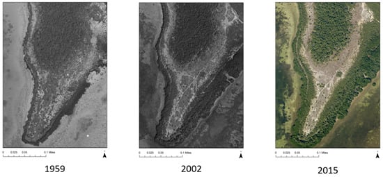 The decline of pine forests on the Florida Keys were documented by Alexander and Dickson III []. Following up on local homesteaders’ accounts of live slash pine trees bordering a remote mangrove swamp on the north end of Key Largo, Alexander and his students found only remains of dead trees. Alexander later attributed the forest’s demise to salinization of the groundwater in response to SLR. More recently, Ross et al. [] stated that the area of pine forest on Sugarloaf Key declined from an initial 217 acres (88 ha; furthest extent of pine remains) before 1935 to 30 ha by 1991. Ross et al. [] suggest that shrinking of the freshwater lens in the coastal uplands of the Everglades is a likely cause of initial vegetation change because of SLR. Figure 6 shows an example of an area on No Name Key (the sparsely inhabited island next to Big Pine Key) with primary upland habitat. Vegetation changes are studied on this island through the use of aerial photographs from 1959, 2002, and 2015. In these images, the vegetation changes to increased mangrove and estuary around the perimeter with shrinking hardwood hammock and pine trees as illustrated in the center of the photographs.