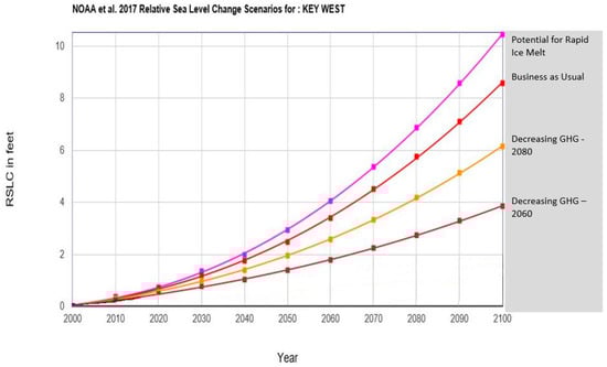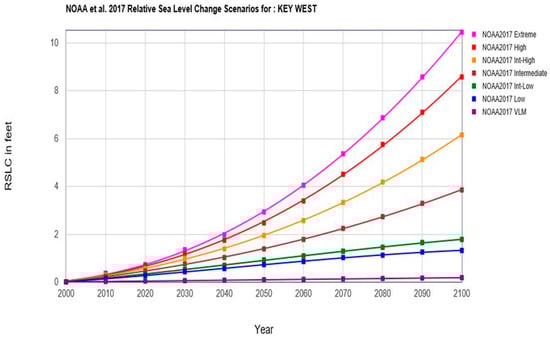 Newer information on scientifically supported SLR projections of IPCC (2013) [] includes recent observational and modeling literature related to the potential for rapid ice melt in Greenland and Antarctica. The projections and results presented in several peer-reviewed publications provide evidence to support a GMSL rise in the range of 1.4 m to 2.7 m by 2100, and recent results regarding Antarctic ice-sheet instability indicate that such outcomes will be more likely than previously thought []. To ensure consistency with these recent updates to the peer-reviewed scientific literature, NOAA recommends a revised “extreme” upper-bound scenario for GMSL rise of 2.5 m by the year 2100, which is 0.46 m higher than the upper bound scenario from [] and IPCC [] employed by the NCA 2014 and 2018 [,]. The NOAA 2017 scenarios [] for the time period of 2050–2100 predict a 0.9 to 1.8 m SLR with surface inundation in the Florida Keys [].