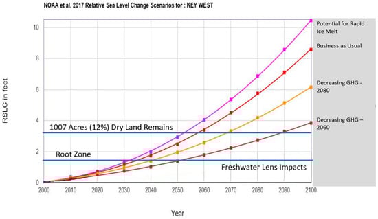 The U.S. Geological Survey (USGS) in the National Oceanic and Atmospheric Administration (NOAA) 2020 updated report recommends the inclusion of impacts from tidal flooding and increasing high tides (an additional 0.30 m) in the Florida Keys. These are considered a high-risk factor for habitat and freshwater pools on the Florida Keys. To address this need, regional SLR projections were updated [,] and examined here. Revisions included recent observational and modeling literature related to the potential for rapid ice melt in Greenland and Antarctica along with other regional processes used to provide climate information at smaller scales. The IPCC concluded in 2013 that there is high confidence that downscaling adds value both in regions with highly variable topography and for various small-scale phenomena [] such as islands and keys.
