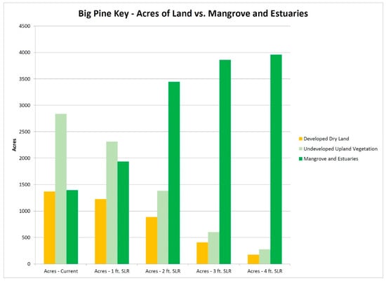 Although a given SLR projection identifies a certain elevation for SLR at some time in the future, that elevation will be periodically reached before then because of short-term pulse events, such as king tides and storm surge []. Future climate change, especially SLR, effects to terrestrial plant and animal life, will be highly significant. The outcome of even the modest SLR scenarios indicates that salt water will begin to negatively affect the root zone of Big Pine Key’s last upland terrestrial vegetation between 2040 and 2060 with 0.6 m of SLR, and the island will be mostly underwater by 2060 to 2080 with 0.9 m of SLR. Vegetation succession will result in mangrove dominance on remaining land and development of more expansive estuaries across much of the island. After 2100, the lower elevation Keys will become all open-ocean habitat. These consequences of SLR in the long term will prove unsustainable and detrimental to the buttonwood and hardwood hammock habitats, important to many endemic species. Declines in capacity of freshwater storage and freshwater resources will be made worse with additive effects of storm surges and unusually high tides. these vegetative and urban transitions mean there is no transition space available for species and habitats, and thus unsustainable. As a result, most available adaptation actions call for creating temporary or permanent freshwater resources for terrestrial species, including the Florida Key deer []. After comparing the Benedict et al. [] workshop findings with the NOAA 2017 [] model scenarios and SLAMM modeling, the findings are very similar. The comparison among findings indicate that stressors can be exacerbated with short-term events like storm surge and tides. Another major area of agreement for sustainability is that multi-dimensional adaptation strategies will continue to be an ongoing process as sea levels rise, habitat changes, fresh water supplies diminish, and plants and animal populations decline.