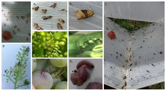 Lobesia botrana: (A,A1–A3); Eupoecilia ambiguella (B,B1–B3); pheromonal trap (C) (Original photo).