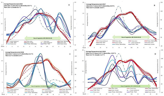Climatogram of Jidvei, Șona, Sânmiclăuș, Tăuni, and Cenade plantations for the years 2016 (A), 2017 (B), 2018 (C) and 2019 (D).